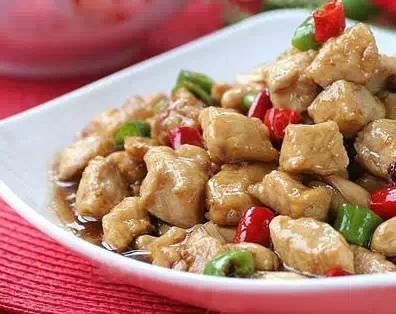 家味宫保鸡 制作方法: 原料:鸡胸肉250克 青红椒各4根 炸花生米50克 葱粒2茶匙(10克)姜末1茶匙(5克)蒜末1茶匙(5克)花椒15粒 干红辣椒6根 调料:盐1茶匙(5克)料酒1/2茶匙(3克)干淀粉2茶匙(10克)米醋2汤匙(30ml)酱油1汤匙(15ml)白糖2茶匙(10克)清水2汤匙(30ml)水淀粉2汤匙(30ml)香油1汤匙(15ml) 做法: 1)鸡胸肉切1cm大小的丁,加入盐(1/2茶匙),料酒和干淀粉搅拌均匀后,腌制5分钟。葱切成比鸡丁稍微小点的粒,葱姜切成末。青红椒切粒。 2)将蒜葱姜放入碗中,调入盐(1/2茶匙),白糖,米醋,酱油,清水,水淀粉调成汁备用。 3)锅烧热,倒入油,再添加少许香油,趁油冷时放入花椒,待花椒出香味,颜色略变深后,放入干辣椒爆香。 4)放入鸡丁炒至变色后,将青红椒粒放入,翻炒10秒钟,倒入调好的料汁,大火翻炒1分钟后,倒入炸好的花生米即可。