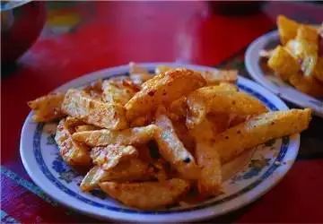 18炸土豆 先把切好的土豆片放在水里煮一会儿,使土豆皮的表面形成一层薄薄的胶质层,然后再用油炸。
